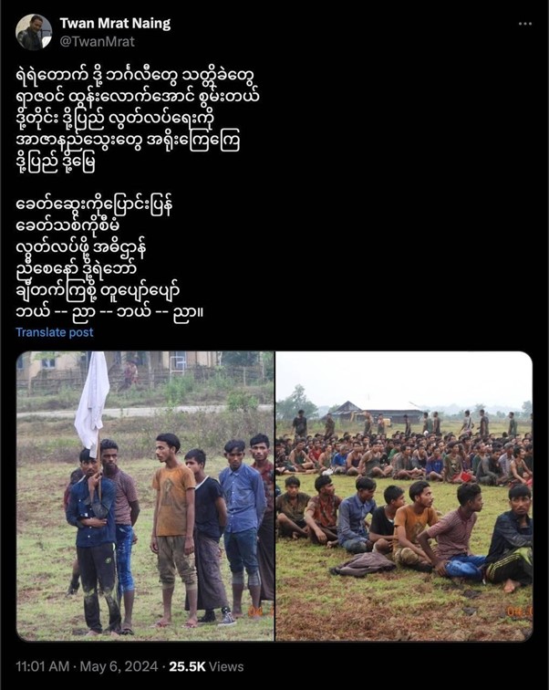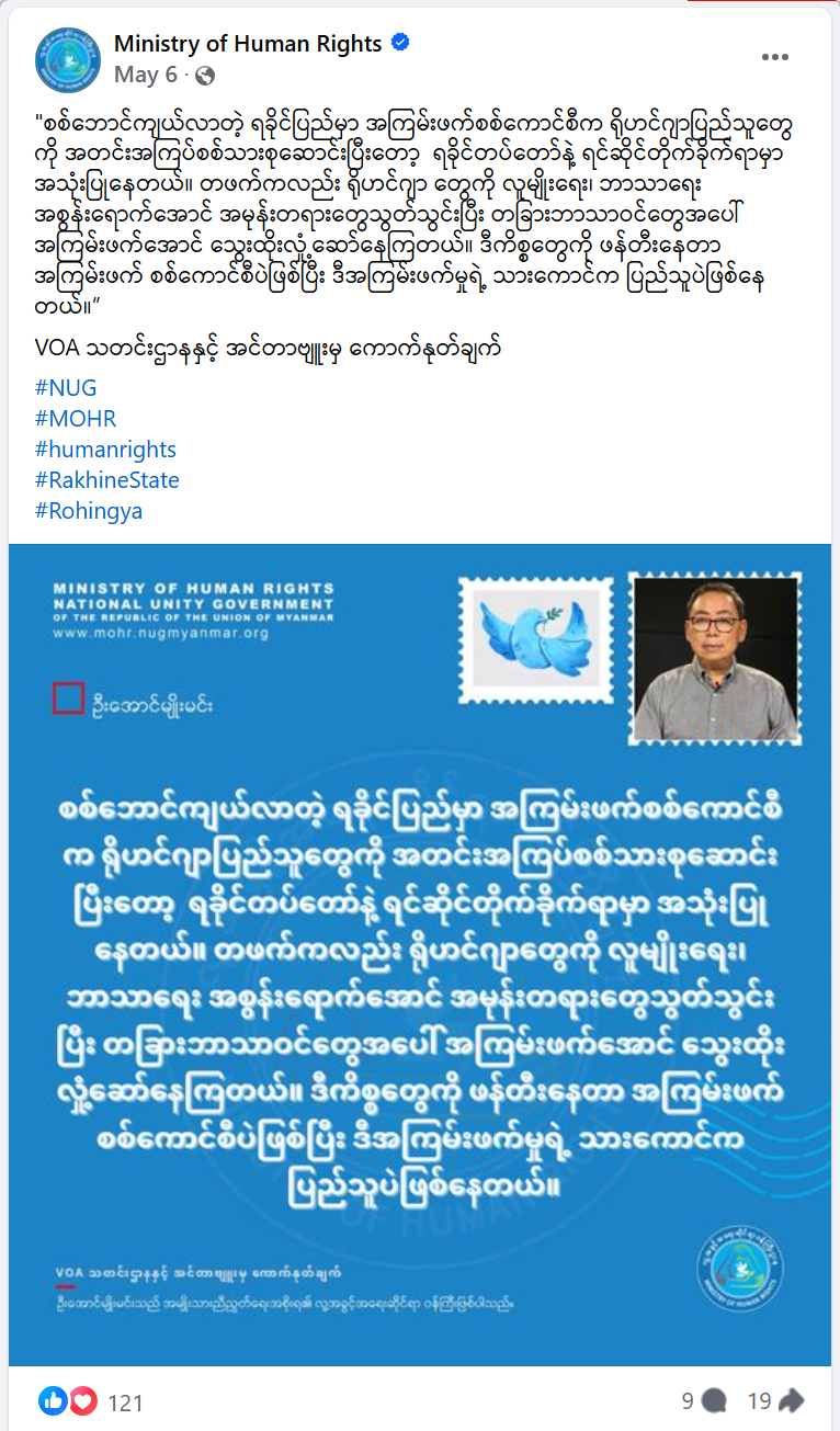 "In Rakhine State, where the war frame is getting wider, the terrorist junta is forcibly recruiting the Rohingya people and using them to fight against the Rakhine army. On the other hand, religious extremism and hatred was instilled into the Rohingya people to incite violence against other religions. Terrorist junta is the one who is creating these issues and our people are the victims of this violence."