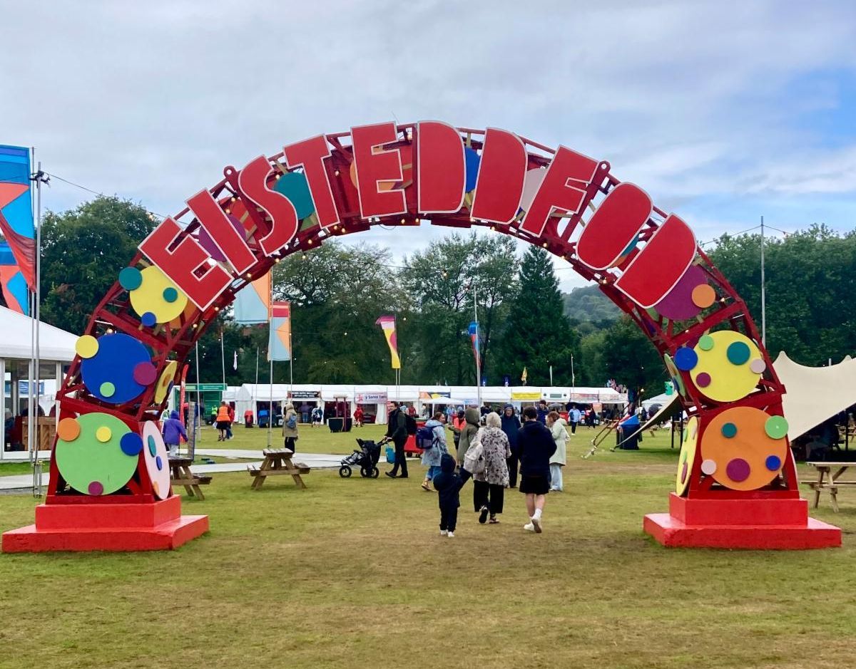 Photos L-R: Eisteddfod arch, Lesley Jones and Jodine Fec at the Eisteddfod sign, and Jodine Fec speaking in the Science and Technology Tent | |