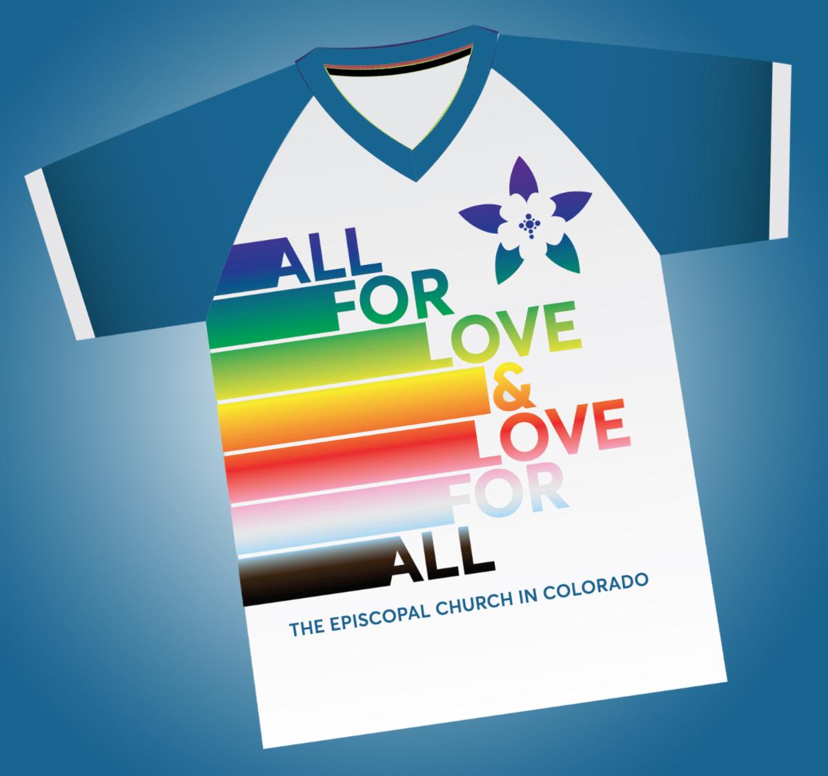 "All for Love & Love for All" Episcopal Church in Colorado shirts! $10 with registration to march or volunteer at booth! *Shipping not available. **Cash or Check only (payable to the Episcopal Church in Colorado). Pick-up at the Office of the Bishop most Tuesdays and Thursdays, 8:30 am to 4:00 pm, or by appointment with Kirsten@EpiscopalColorado.org.