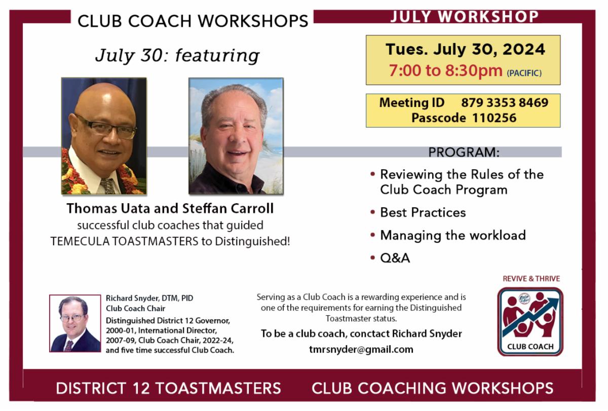 Club Coach Corner - Next Workshop July 30th, 7:00 - 8:30 pm