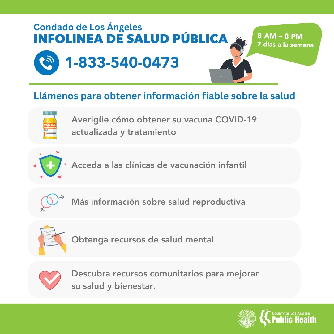 ¿Es usted residente del condado de Los Ángeles y necesita ayuda para acceder a servicios de salud o tiene preguntas relacionadas con la salud? ¡El equipo de InfoLine de Salud Pública lo puede ayudar!