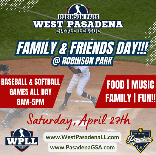 Join us tomorrow, Saturday, April 27th at Robinson Park for the West Pasadena Little League Family and Friends Day! See flyer below.