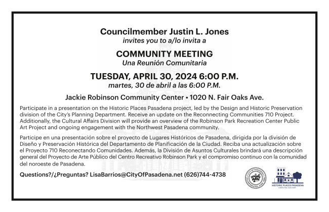 I'm excited to see you at our District 3 Community Meeting at the Jackie Robinson Community Center on Tuesday, April 30 from 6:00 - 7:30 p.m. Join us for a presentation on the Historic Places Pasadena project by the Design and Historic Preservation division of the City's Planning Department. Get updates on the Reconnecting Communities 710 Project, and learn about the Robinson Park Recreation Center Public Art Project from the Cultural Affairs Division.