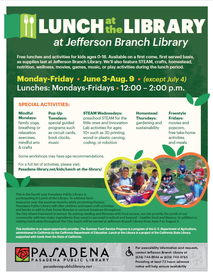 Classes take place at 9:30 am on the first Wednesday of each moth at the Jackie Robinson Community Center, 1020 N. Fair Oaks Ave. Pasadena, CA 91103