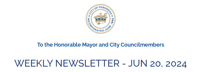 Welcome to the City of Pasadena City Manager’s weekly newsletter. Whether you are a long-time resident, a newcomer, a student, a business, or a commuter who works in our City, we hope that this will prove to be a great resource for you.