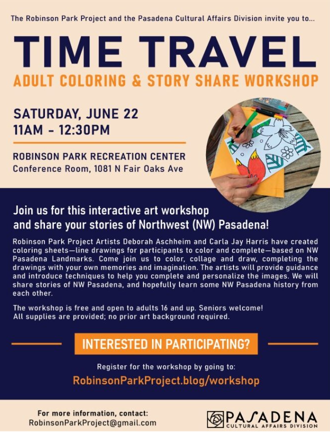 Join the Robinson Park Project for an Adult Coloring & Story Share Workshop at the Robinson Park Recreation Center, tomorrow, June 22nd at 11am. An opportunity to share your stories of Northwest Pasadena. Scroll to see the flyer below.