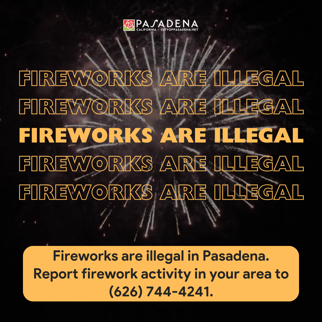 Help keep our community—our children, our homes and our property—safe from illegal fireworks. If you see something, say something! Call Pasadena Police Department at (626) 744-4241 to report illegal fireworks and other suspicious activities. Residents may also use the City Service Center mobile app (Pasadena CSC), available on Google Play and the App Store, to report illegal fireworks.