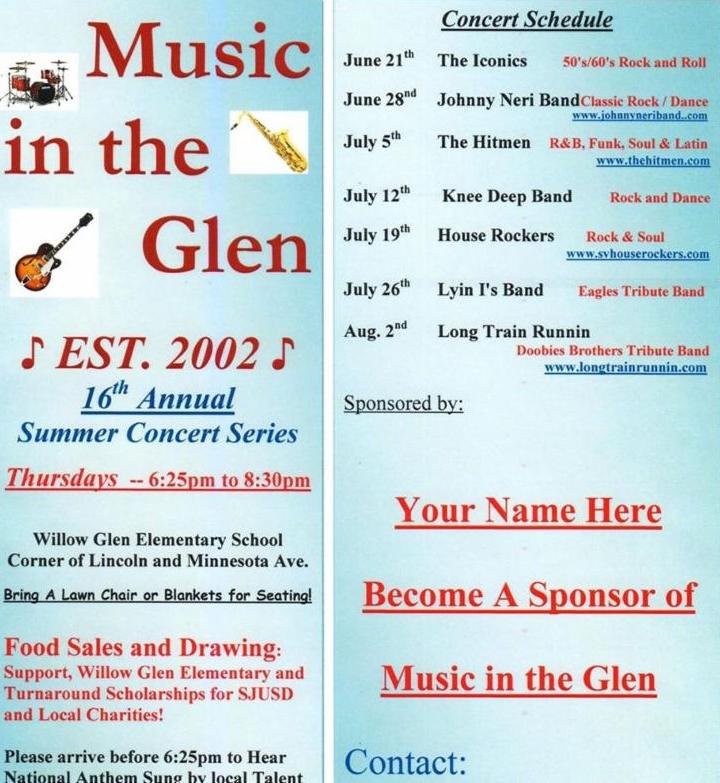 Music in the Glen will be on Thursdays from 6:25-8:30 PM this summer! Please see the flyer for specific dates and times.