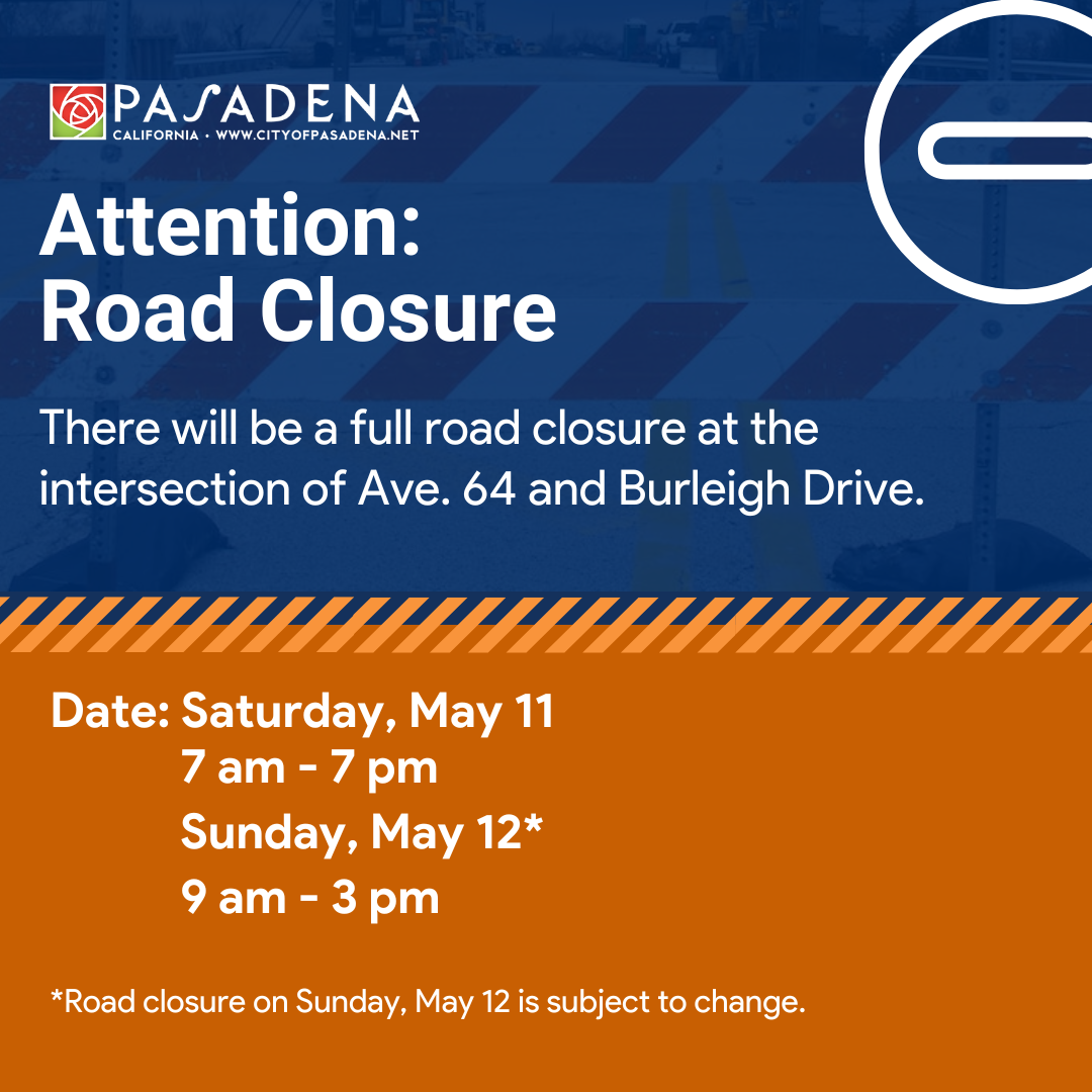 Ave. 64 Full Road Closure 5/11 & 5/12 | Phase 3 construction of Avenue 64 Complete Streets project continues at the intersection of Burleigh Drive along Avenue 64. A full street closure from Saturday, May 11, to Sunday, May 12 (if necessary), will be required as the transition between phases occurs. The newly constructed roundabout at the intersection of Burleigh Drive and Avenue 64 is mostly completed as part of the previous phases. There will be a new traffic pattern for the southbound traffic where it will loop around a newly constructed roundabout and the northbound traffic pattern will be unchanged. During construction one lane for each direction of traffic will be maintained however, please anticipate delays, and use alternate routes when possible. The overall construction completion is anticipated to be in summer of 2024. Please contact Janina Lyka Baiza, Project Manager, at (626) 744-3703 if you should have questions. Source: Pasadena Public Works Department. | |