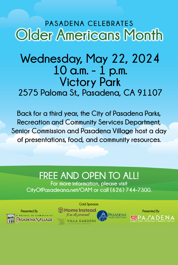 Older Americans Month Event 5/22 | The City of Pasadena Parks, Recreation and Community Services Department, Senior Commission, and Pasadena Village will host the City’s third annual celebration of Older Americans Month on Wednesday, May 22, from 10 a.m.-1 p.m. at Victory Park, 2575 Paloma St. The free event will highlight Pasadena’s array of resources for older adults and offer giveaways, food, presentations and much more! More information and a list of exhibitors is available here. Source: Pasadena Parks, Recreation and Community Services Department, Senior Commission, and Pasadena Village. | |