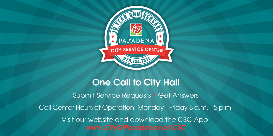 The City Service Center (CSC, formerly known as the Citizen Service Center) is a centralized service to help Pasadena residents connect with their city. CSC is available via web, LiveChat, mobile app, and phone to assist in answering questions about City programs, services, and events. Our knowledgeable representatives can help you find the information and assistance you need. Access to City Hall is now just a simple click away, 24 hours a day, 7 days a week. Next time you spot graffiti in your neighborhood, hit a pothole on your way to work, or notice an abandoned shopping cart on your street, just use the City Service Center to report it. Simply open the CSC app, website, or make a call to report an issue. Your issue will be automatically routed to the appropriate department for investigation. You can also track the status of your requests. For more information, or to submit a request, please click here. | |