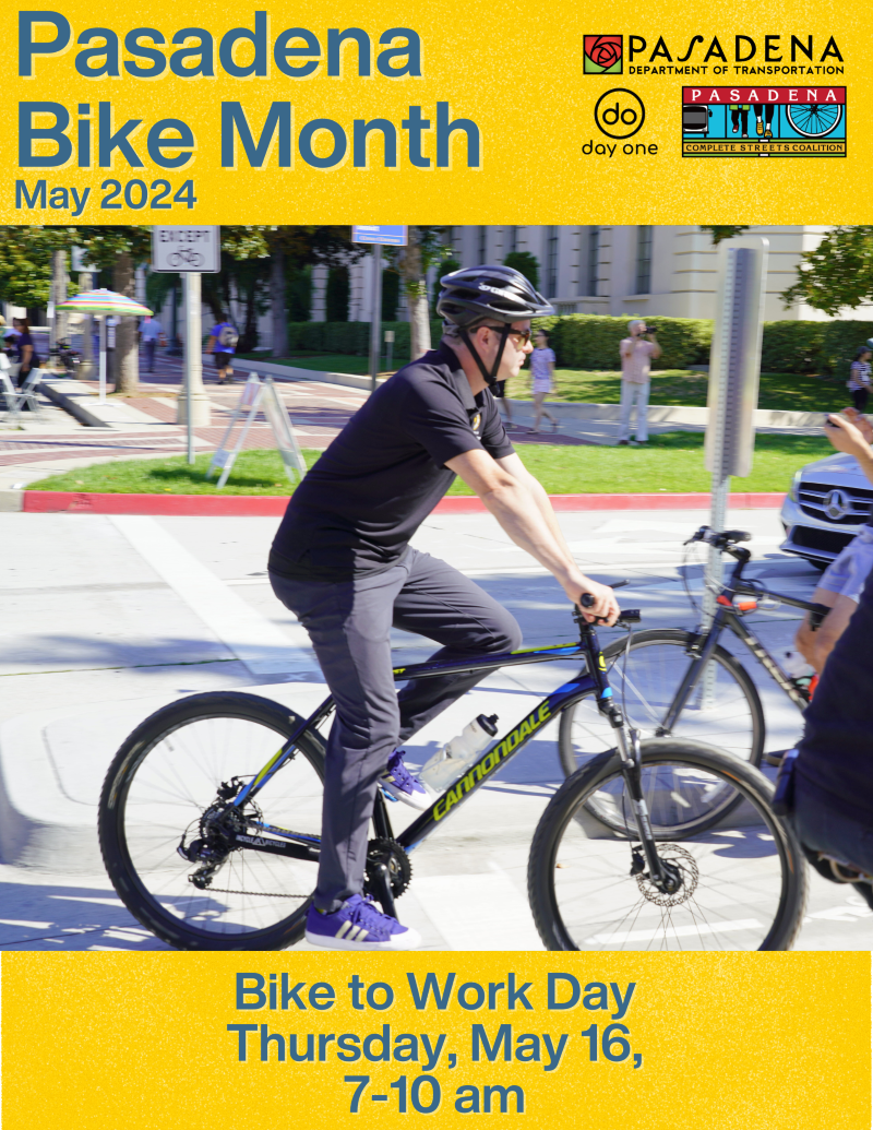 Bike to Work Day will be held from 7-10 a.m. on Thursday, May 16. Visit the Bike to Work Day rest-stop at Pasadena City Hall to say hello and enjoy free refreshments to help fuel your ride, pick up some biking information, and enjoy other free goodies. Remember, if you need to travel far, go multimodal. Metro buses and trains, Metrolink trains, and Pasadena Transit buses are free for bicyclists on Bike to Work Day. Click here for more information. Source: Pasadena Transportation Department, Day One, and Pasadena Complete Streets Coalition. | |