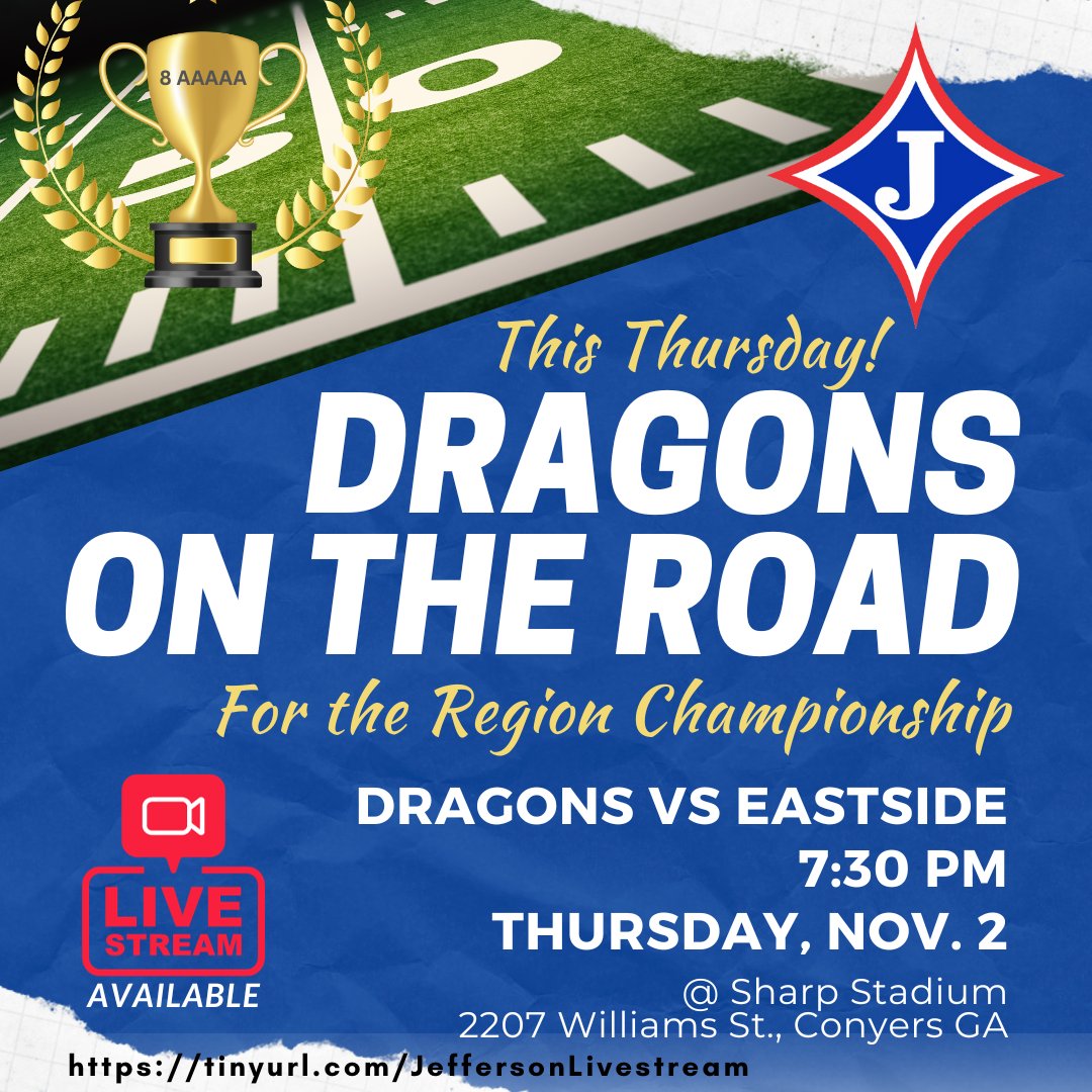 Congratulations to the JHS Dragons who are 9-0 this year and headed into their last regular season game this THURSDAY (not Friday) night at Eastside in Covington.