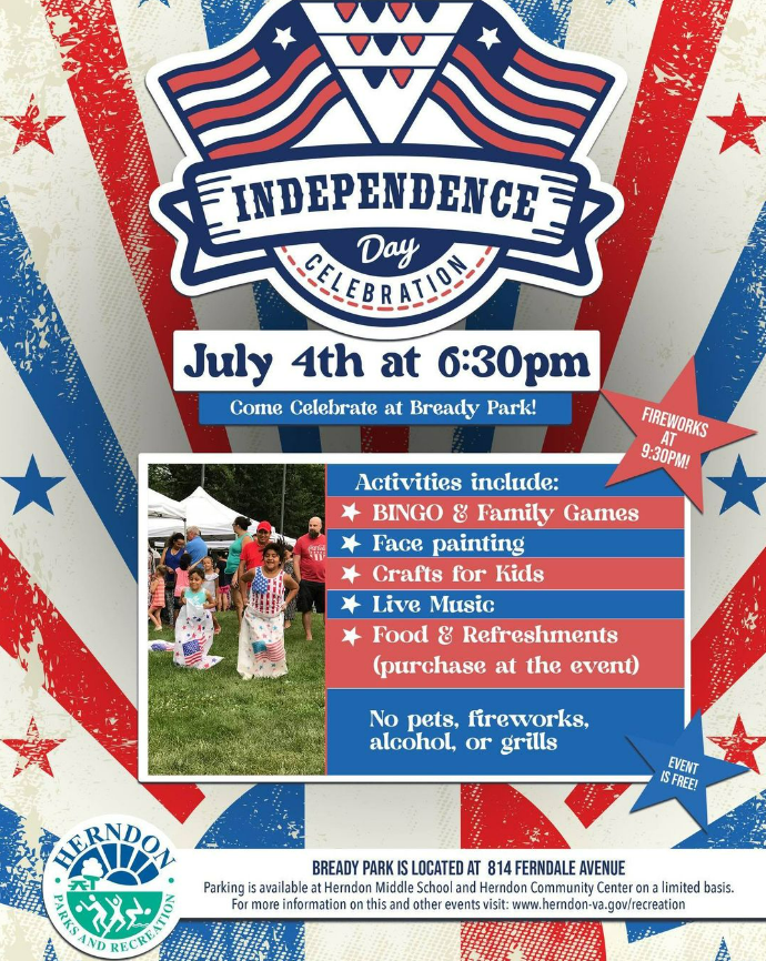 Join the Town of Herndon for a celebration and fireworks display on Thursday, July 4 in Bready Park. There will be live music, bingo and family games, and of course, fireworks! You don't want to miss it.