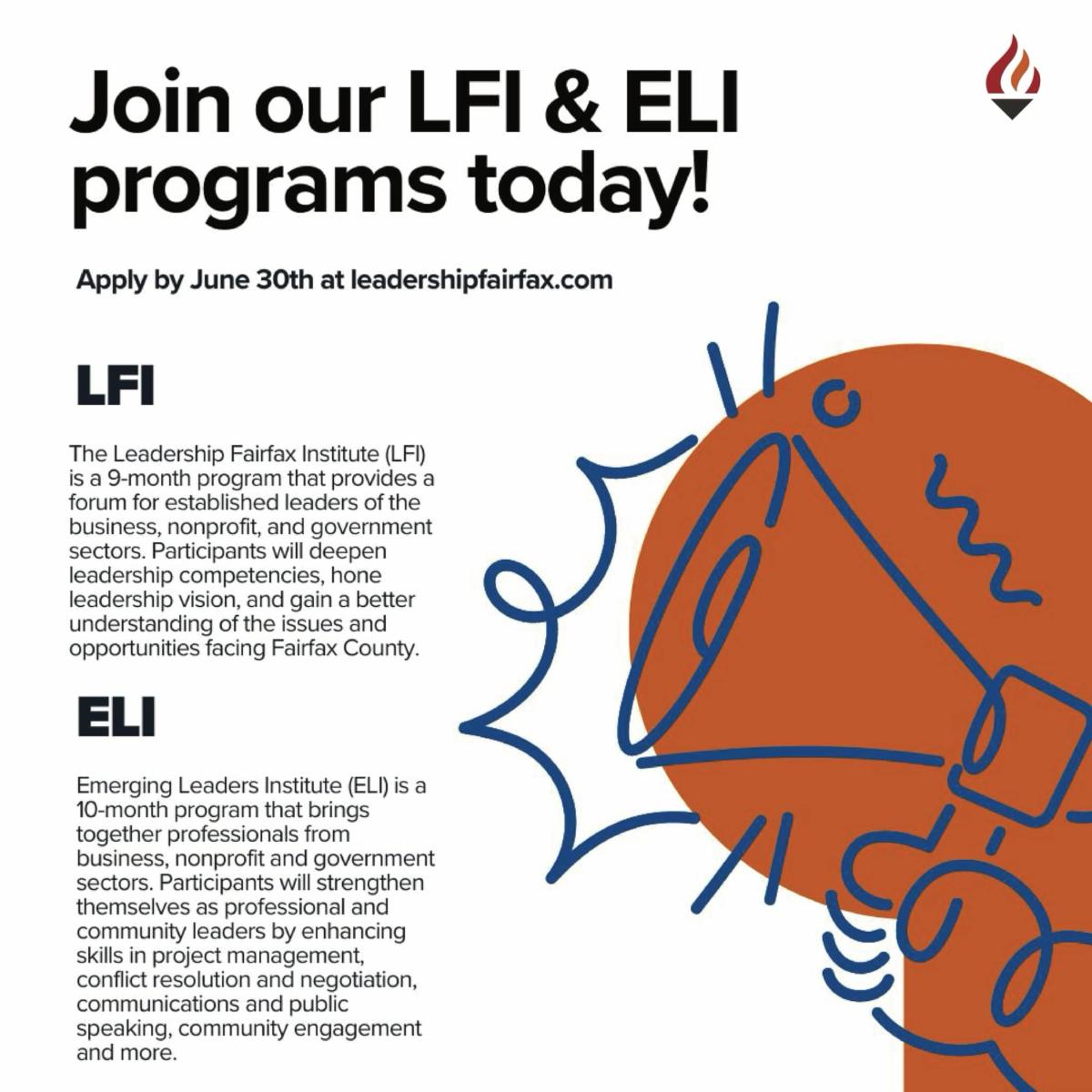 Leadership Fairfax is now accepting applications for their professional leadership development programs – Leadership Fairfax Institute (LFI) and Emerging Leaders Institute (ELI). The application deadline is Sunday, June 30, 2024, with programs set to commence in September 2024.
