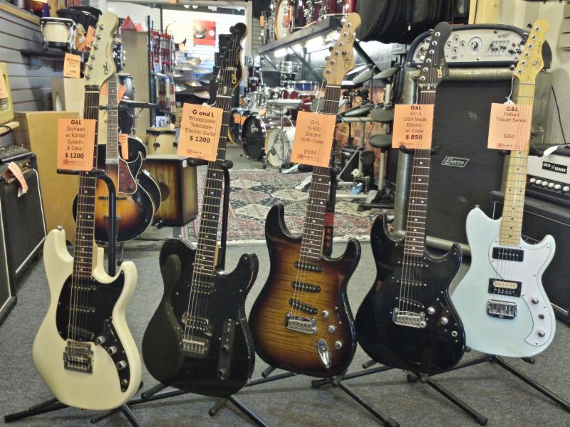 G&L Leo Fender Design Skyhawk w/case $1199, G&L Broadcaster Tele $1199, G&L S500 w/case $1095, G&L SC3 w/case $849, G&L Fallout Tribute Series $350