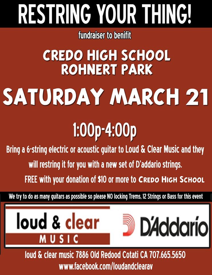 What could be better than getting free strings donated by our kind friends at D'addario, having a Loud and Clear Tech put them on for you AND helping a great cause? All proceeds go to Credo High School. We are thankful to be able to help raise funds for this awesome local non-profit.