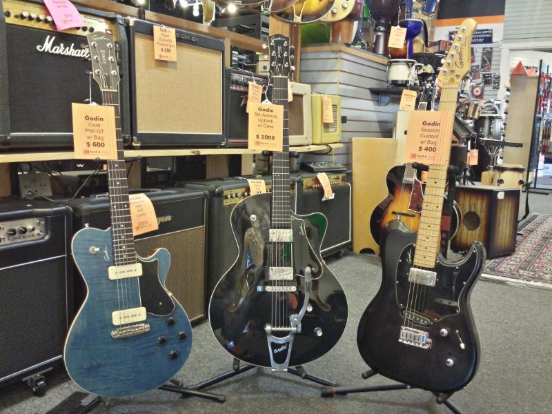(left) Godin Core P90 GT w/bag $599, (middle) Godin 5th Ave Uptown w/case $999,