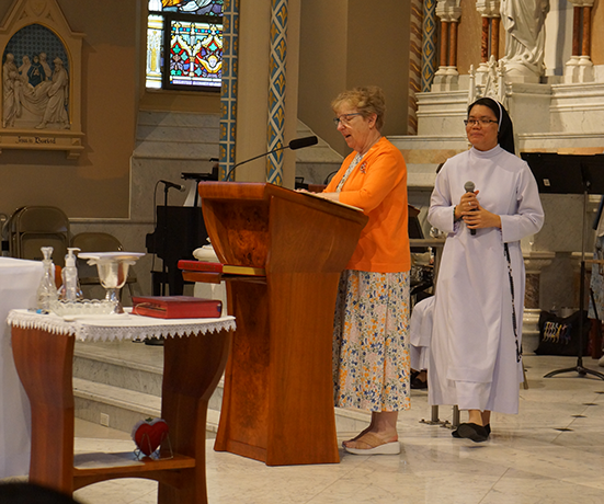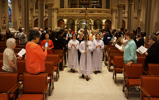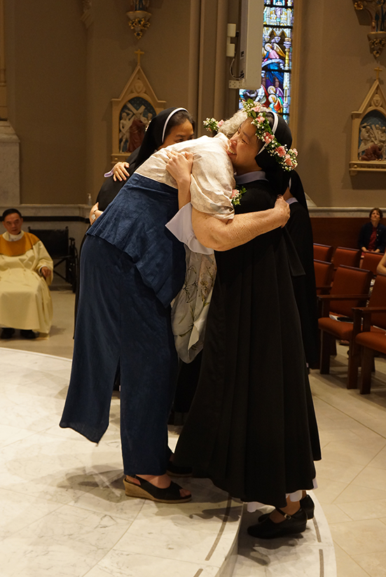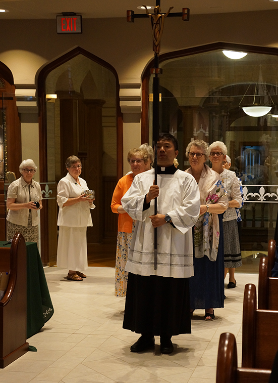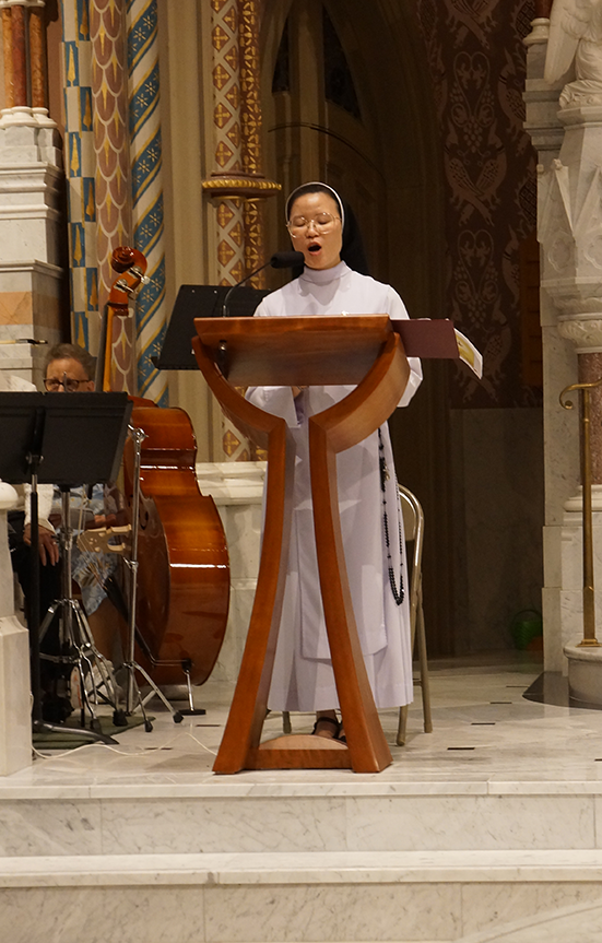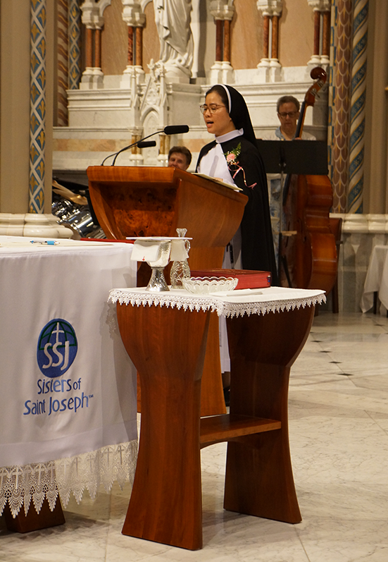 Congregational President, Sister Maureen G. Erdlen SSJ, warmly greeted all present, including Dominican sisters, priests, deacons, family and friends (present and virtual). Sister Maureen began her welcome in Vietnamese. “Xin cháo mùng tãt cá moi nguòi. (Welcome everyone!) Xin chào mùng moi nguòi than gia vói chúng tôi/trong ngày dǎc biêt hôm nay. (We welcome everyone to join us at this special Mass.) We gather in great joy as we celebrate God’s goodness and love, especially as it is expressed through our vocation to the consecrated life. We pray with and for our Sisters Huong, Dung and Thoa as they courageously and lovingly respond to God’s call and commit themselves to lives of love and service. We rejoice with our Dominican Sisters of Bui Chu Vietman as they have become part of our lives here and we are grateful for all the ways in which we have become one and they have made us more aware of our global Sisterhood.