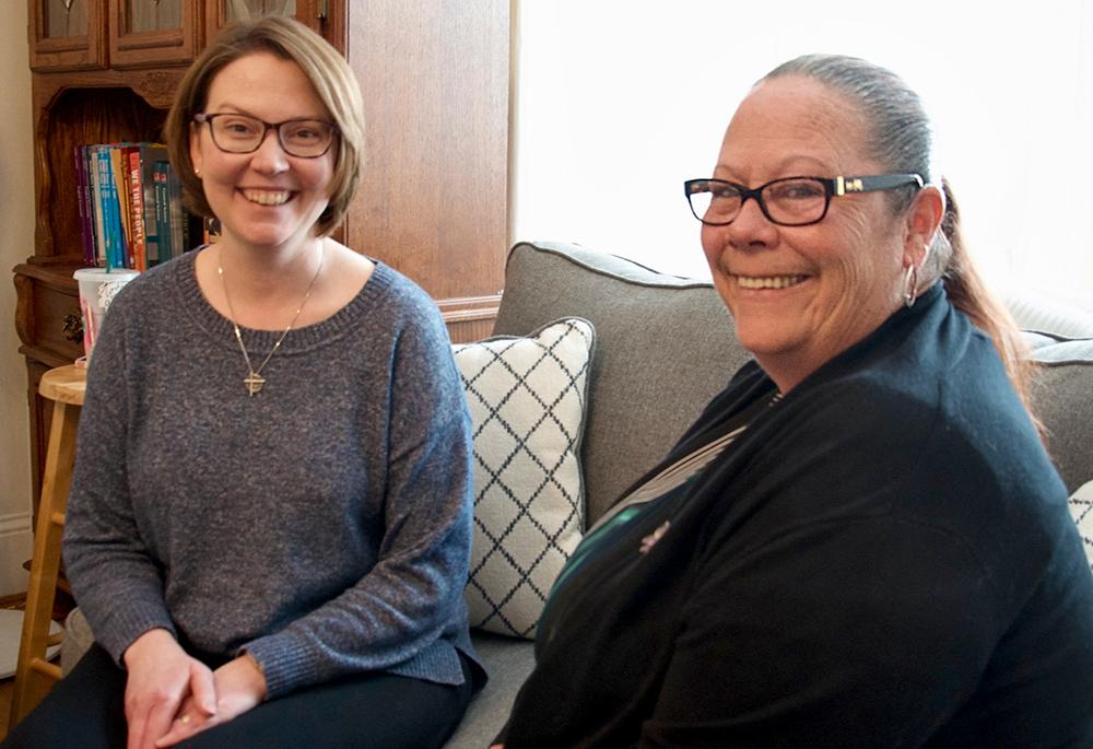 Sister Meaghan Patterson SSJ, left, and Ann Marie Jones are seen March 21 at Dawn’s Place. | |