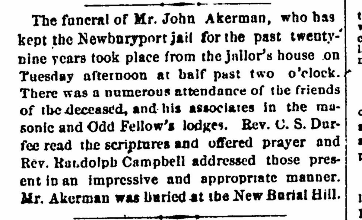 John Akerman (1796-1871) was the Newburyport jailer for nearly thirty years and lived on the site with his wife, Elizabeth, who was matron of the jail. His funeral in 1871 was held in the jailer's house, and he is buried at Oak Hill Cemetery.