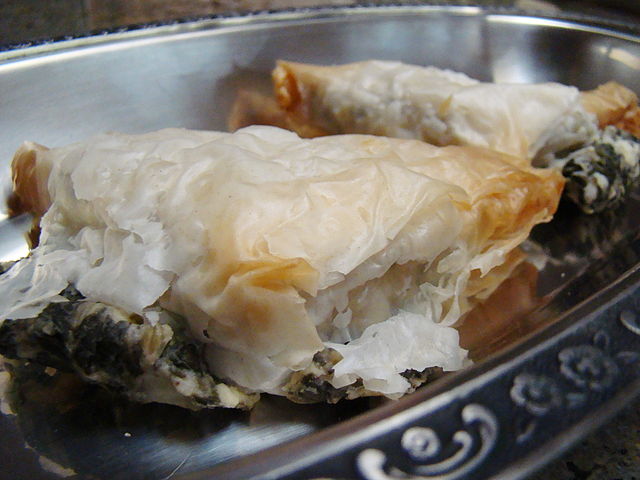 - To assemble the spanakopita: Line the baking dish with two sheets of phyllo (fillo) letting them cover the sides of the dish. Brush with olive oil. Add two more sheets in the same manner, and brush them with olive oil. Repeat until two-thirds of the phyllo is used up.