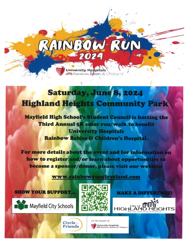 Mayfield High School Student Council is hosting their 3rd Annual Rainbow Run/Walk to benefit University Hospital's Rainbow Babies and Children's Hospital.