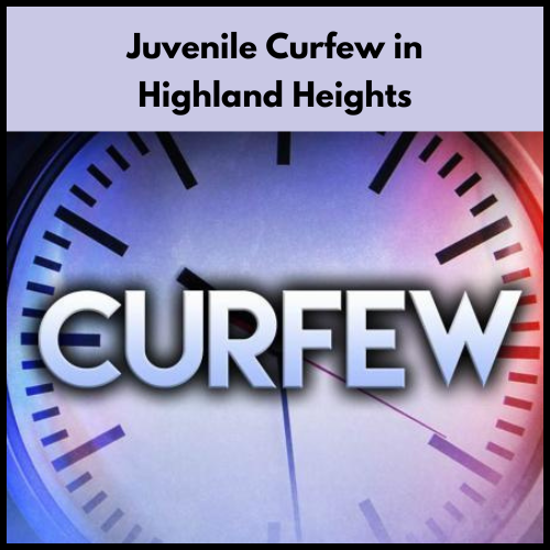The City of Highland Heights Codified Ordinance 509.09 details the curfew laws. No child under the age of twelve years shall be out in public between the hours of darkness to dawn. No child twelve to fifteen years of age shall be out in public between the hours of 11:00 p.m. and 6:00 a.m. No child sixteen or seventeen years of age shall be out in public between the hours of 12:00 midnight and 6:00 a.m.
