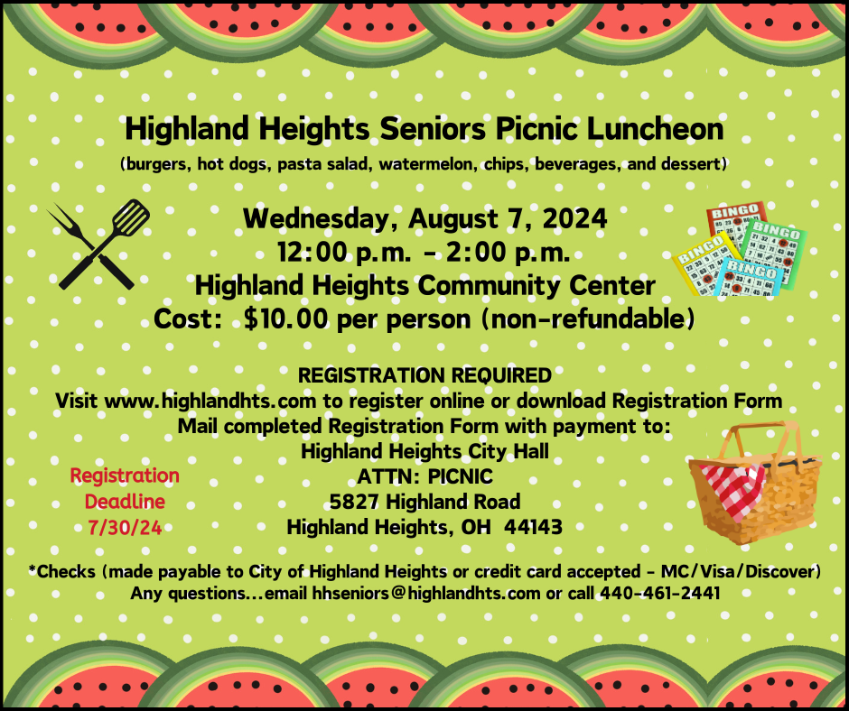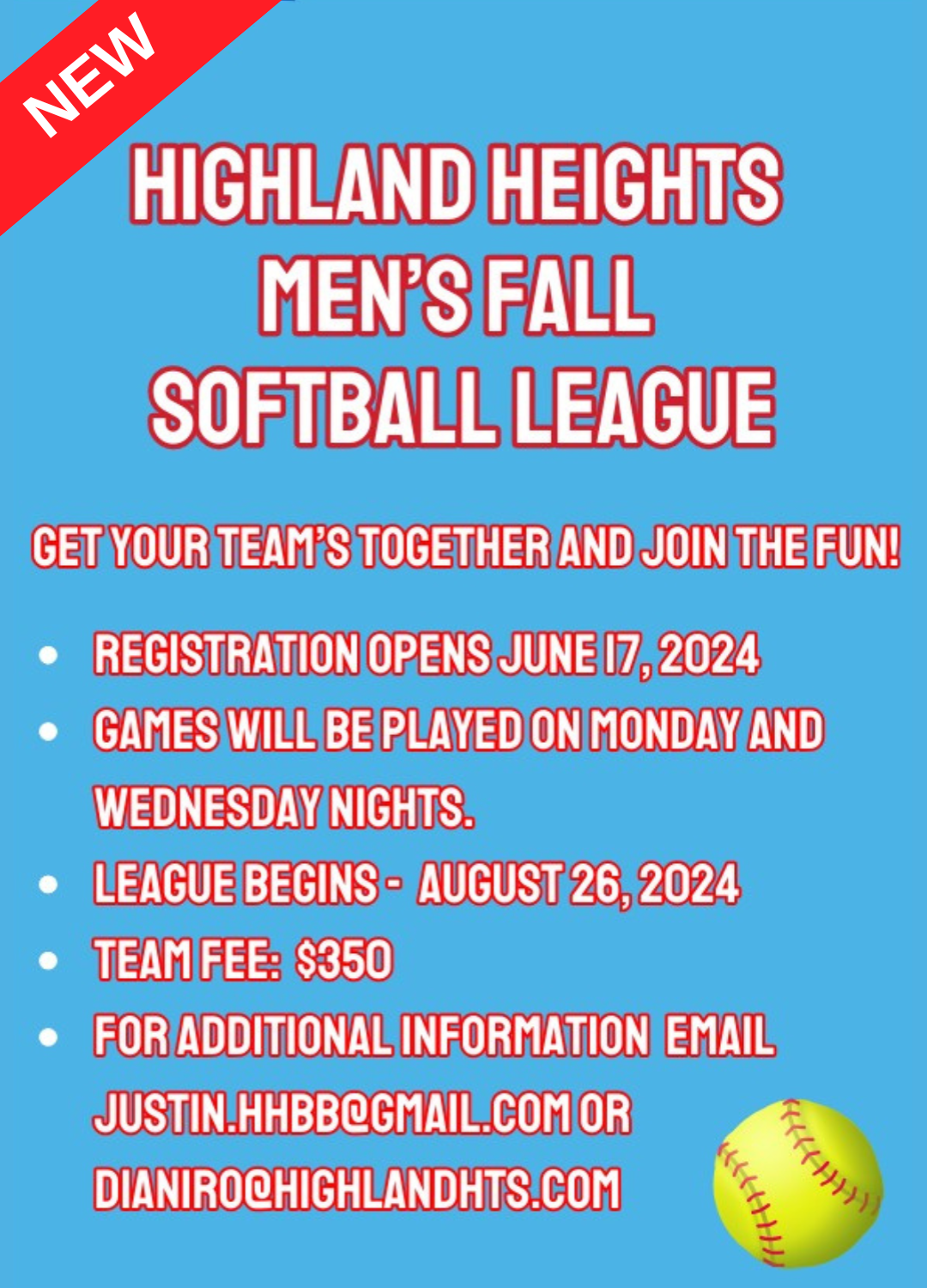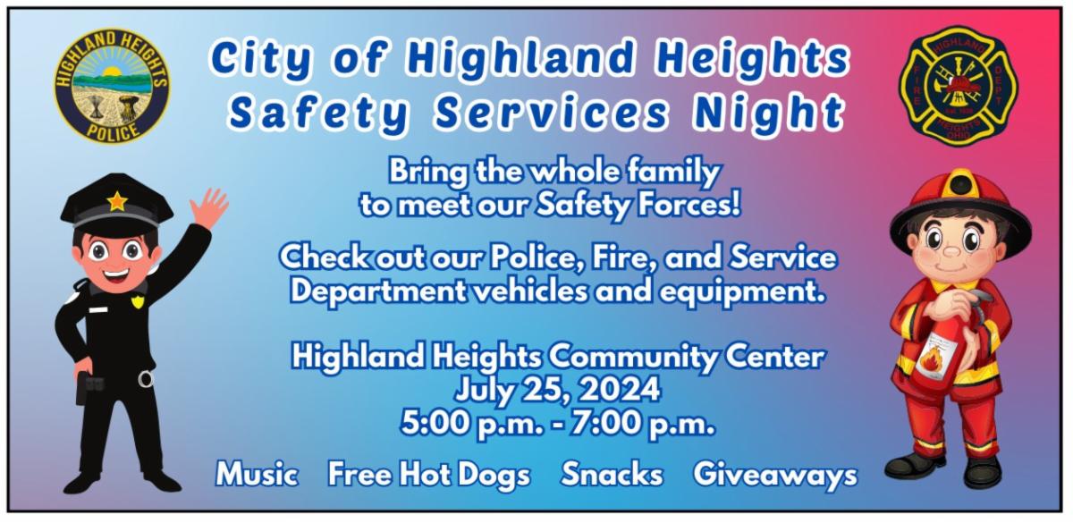 Our next big event is Safety Services Night, which will be held this Thursday, July 25th from 5:00 p.m. - 7:00 p.m. at the Highland Heights Community Center and parking lot. Bring the whole family to meet our First Responders and staff members from the Police, Fire, and Service Departments. Equipment and large vehicles will be on display, and free hot dogs, snacks, and giveaways will be available. Police Chief, Dennis Matejcic, Fire Chief, William Turner, Service Director, Brian Belfiore, and their staff look forward to meeting you.
