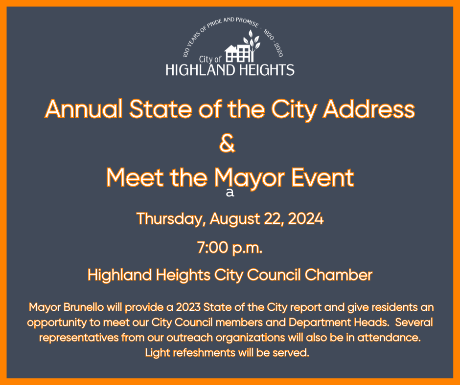 Save the date for my State of the City Address, which will be held on Thursday, August 22, 2024, beginning at 7:00 p.m. in the Council Chamber. I will provide a 2023 State of the City report and you will have an opportunity meet our City Council members, Department Heads, and representatives from our outreach organizations.