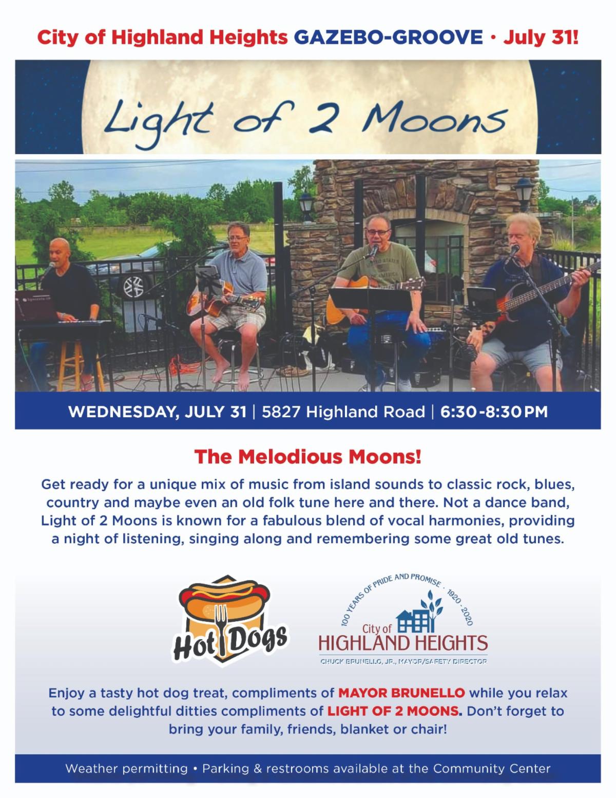 Our next Music at the Gazebo will be held on Wednesday, July 31st from 6:30 p.m. - 8:30 p.m. and will feature Light of 2 Moons. I will be on site grilling hot dogs for all in attendance. Grab your chairs and blankets and join me for an enjoyable evening of classic rock, blues, and country music tunes.