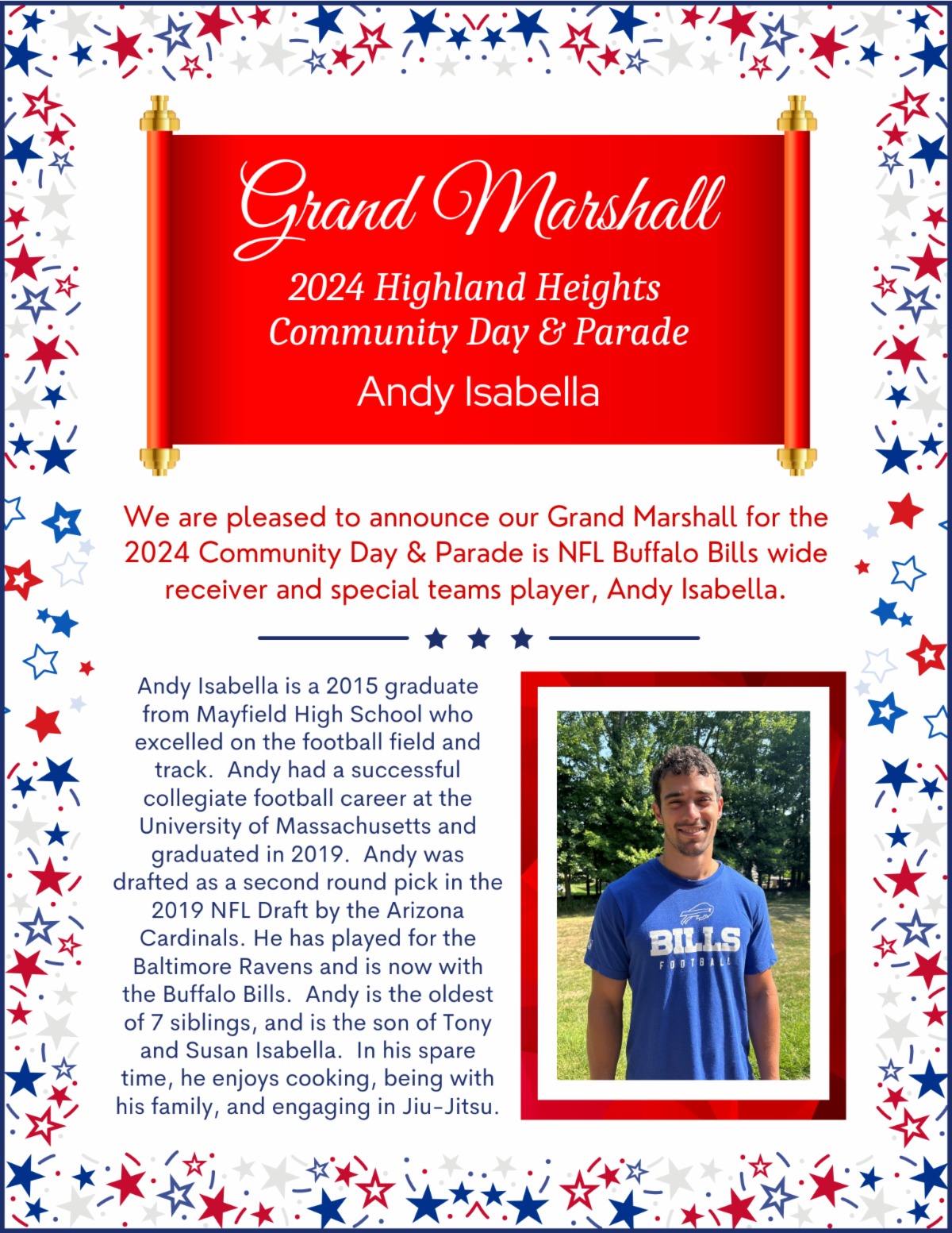 I would also like to recognize our 2024 Grand Marshall, Andy Isabella. Andy is currently playing in the NFL for the Buffalo Bills as a wide receiver and special teams player. Andy and his family are longtime residents of Highland Heights and we could not have been more excited that he was able to be in town to be a part of our celebration. We wish Andy all the best in his upcoming season.