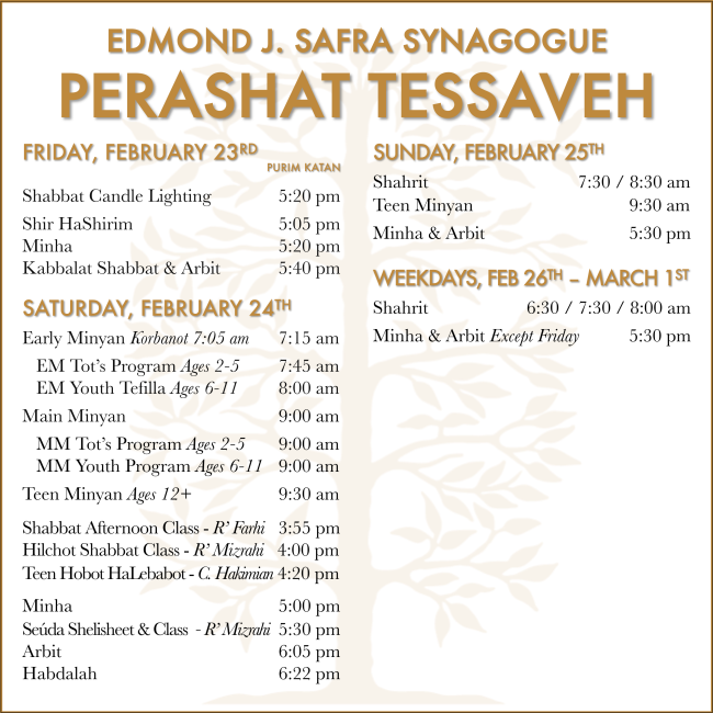 Early Minyan Breakfast, Shabbat Afternoon Class, Hilchot Shabbat Class and Seúda Shelisheet are available for sponsorship.