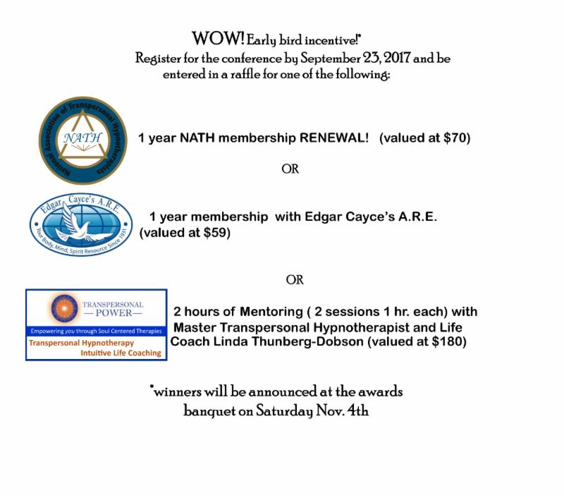 Remember, there is an incentive for registering by September 23! We will enter your name in a drawing for either a 1 yr. NATH membership renewal, a 1 yr. membership with A.R.E. or 2 hours of mentoring with NATH president, Linda Thunberg- Dobson. Winners will be announced at the awards banquet Saturday Nov 4th.