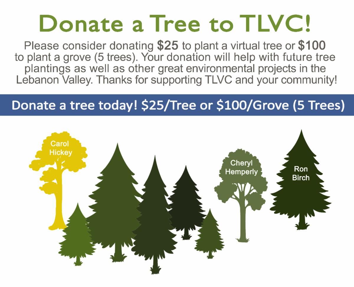 When you donate, your tree/trees will be added to the picture. Donate online here or send a check, payable to TLVC, to 770 Cumberland St., Suite A, Lebanon, PA 17042. *Please note "tree donation" in your memo line or online under special instructions. Thanks for supporting the environment and your community!
