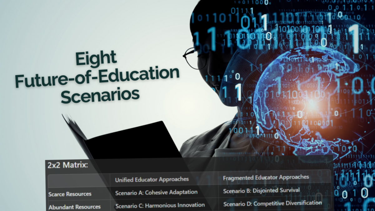 Prompt: "I am interested in developing an education strategy for the future. Please explore how the strategy might differ under varying AI development scenarios. Consider the following variables: Resource availability: Scarce vs. Abundant and Educator approaches: Unified vs. Fragmented.”