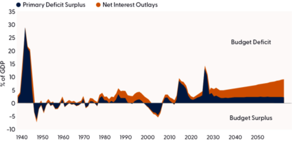While there are still several months until the election is decided, the expectation is that regardless of who ultimately becomes our 47th president, the biggest loser could be the fiscal deficit. Per the Congressional Budget Office (CBO), the U.S. government is expected to run sizable deficits over the next decade — to the tune of 5% – 7% of gross domestic product (GDP) each year. According to the CBO, the deficit increases significantly in relation to GDP over the next 30 years, reaching 8.5% of GDP in 2054. That growth results from rising interest costs and large and sustained primary deficits. CBO deficit projections assume the personal tax cuts within the TCJA will expire at the end of 2025, so deficits are likely to be even higher assuming either Kamala Harris or Donald Trump will extend most, if not all, of the tax cuts. If tax cuts are fully extended, budget deficits are expected to be in the 7%–8% range of GDP over the next decade. Deficits will remain elevated regardless of who is in the White House in 2025, even without new spending or tax cuts due to higher spending on Medicare and Social Security plus the (growing) interest expense on the (growing) debt pile.