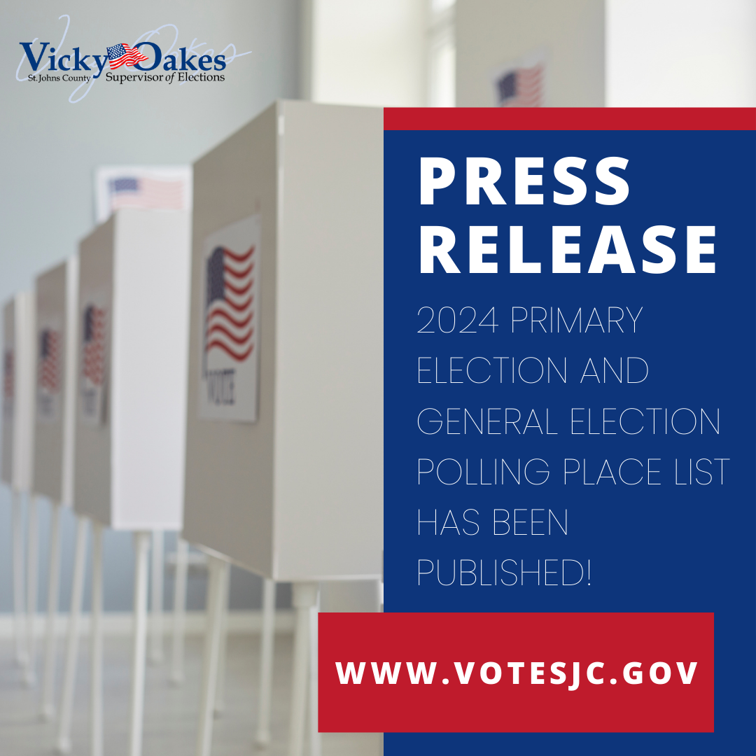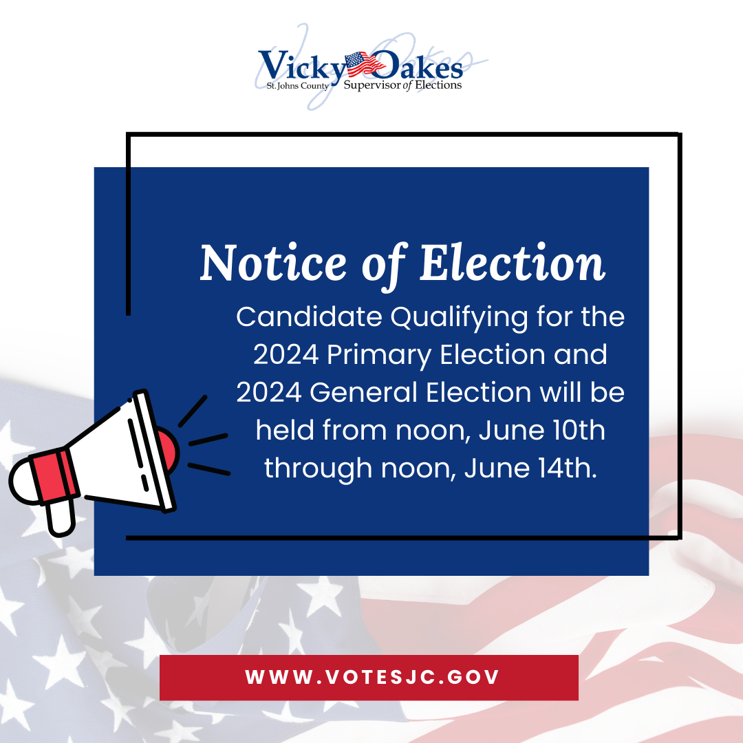 This month also saw the start of the candidate qualifying period for candidates running in the fall elections. Qualifying papers began being accepted Tuesday, May 28, pursuant to Section 99.061(8) F.S. for the candidate qualifying period beginning noon, June 10, through noon, June 14, 2024. The St. Johns County Supervisor of Elections Office is a qualifying officer for all County Offices, such as Clerk of Court and Comptroller, Property Appraiser, Sheriff, Supervisor of Elections, Tax Collector, County Commission, and School Board Members, Special Districts, Municipalities, and Community Development Districts. Political party committeemen and women will also file with the St. Johns County Supervisor of Elections Office. Candidates for State Senate and State Representative file with the Florida Division of Elections in Tallahassee.