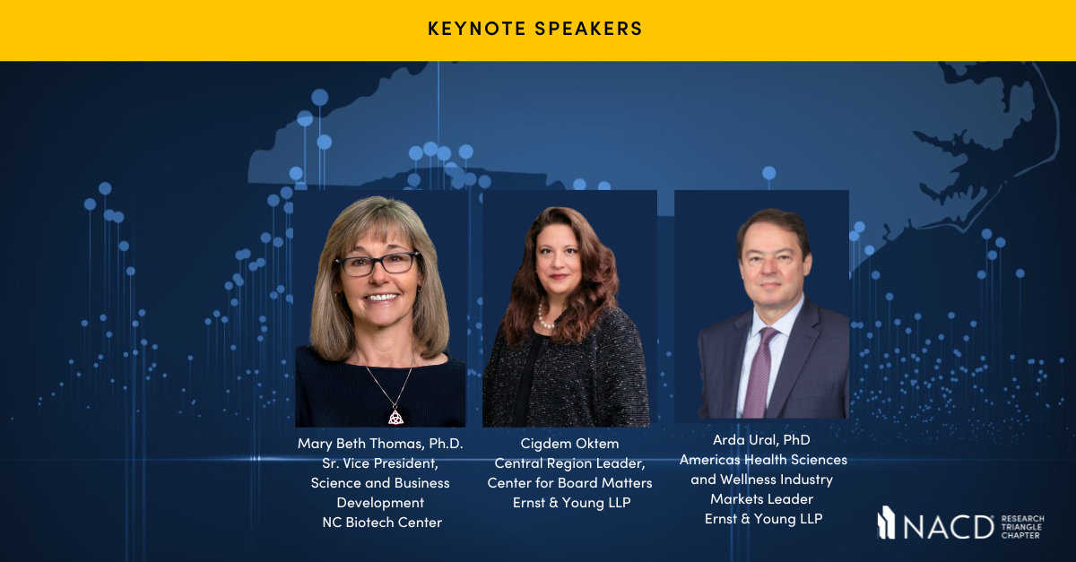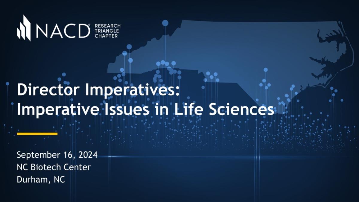 The risks and rewards remain high for directors of life sciences companies of all types. The NACD Research Triangle Chapter is pleased to offer an overview of the geopolitical factors shaping the industry, including a global view from EY’s Beyond Borders biotechnology report and an update on the 5-year strategic plan from the NC Biotechnology Center. | |