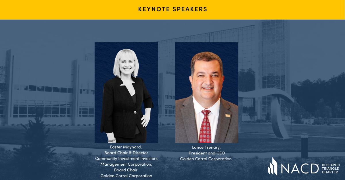 Start your day with perspectives from keynote speakers Easter Maynard, Board Chair & Director of Community Investment with Investors Management Corporation and Board Chair of Golden Corral Corporation, and Lance Trenary, President and CEO of Golden Corral Corporation. They will discuss how Golden Corral's board has governed risk factors over the years, including the impacts of Covid and reputational impacts on their brand, all while fostering a "People First Culture.".