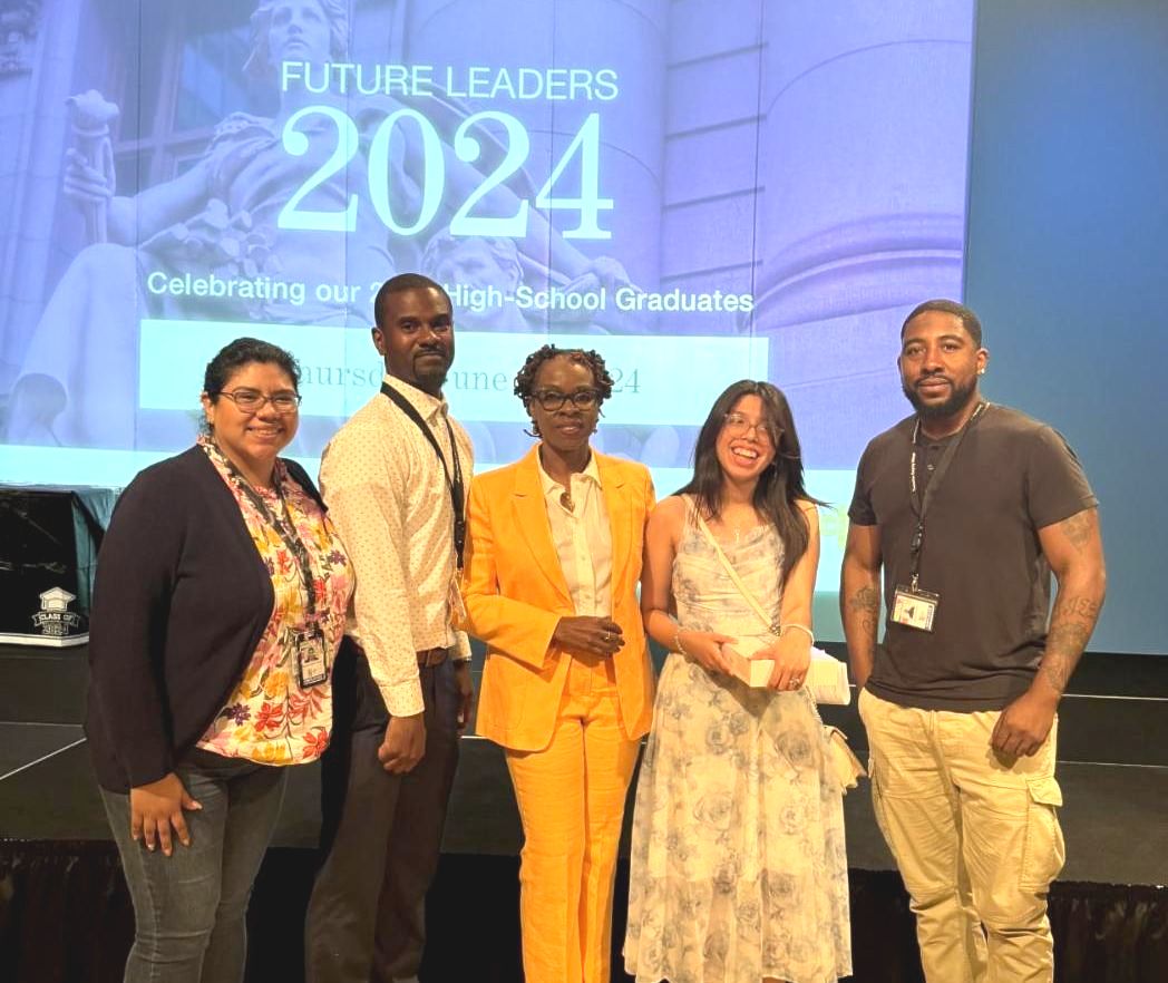 (l to r) Recreation Coordinator Denisse Lozano-Abarca, Education Coordinator Antoine Johnson, NYC Department of Homeless Services Administrator Joslyn Carter, Kimberly Curiel Silverio, and Security Counselor Jamel Mckithen.