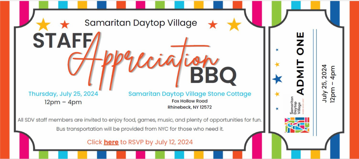 Samaritan Daytop Village’s 2024 Staff Appreciation BBQ is July 25, 12-4 pm, on our Rhinebeck campus. There will be plenty of food, games, music, and fun. Rain date is July 26.