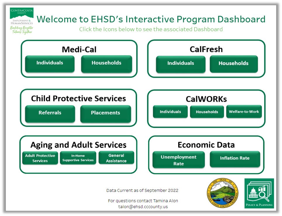 Since 2019, EHSD has publicly posted monthly data dashboards that show how many people we assist through key programs such as CalFresh, Medi-Cal and more. The next generation EHSD Interactive Program Data Dashboard has additional dimensions and analytical features.