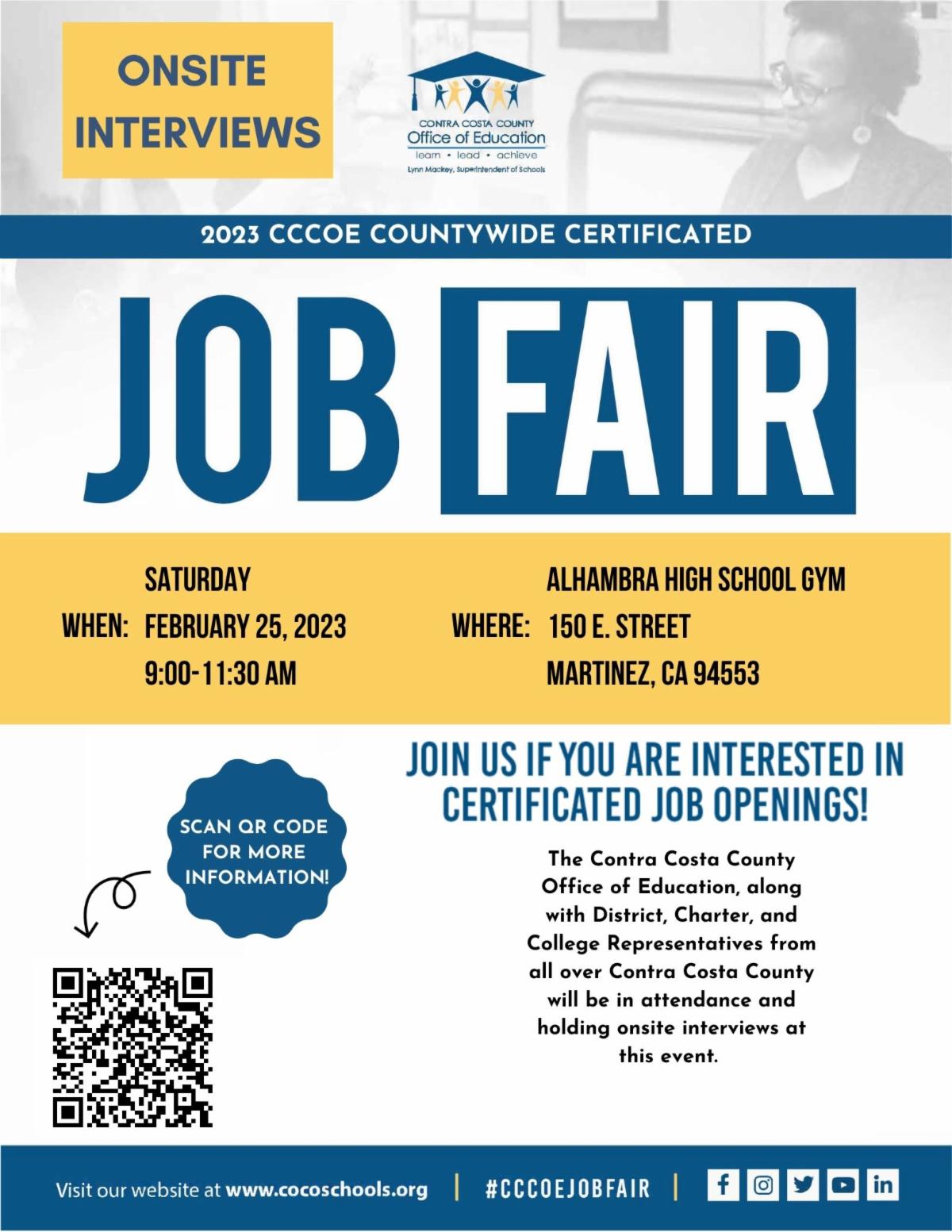 Contra Costa County Office of Education will be holding a job fair on Saturday, February 25, 2023 from 9:00-11:30am located at Alhambra High School (150 E Street, Martineza, CA). Onsite interviews will be held and we highly encourage you to bring your resume when you attend. Please click the button below for more information about current open jobs. Questions? Please contact Morgan Broshar at 925-942-3489 or mbroshar@cccoe.k12.ca.us. | |