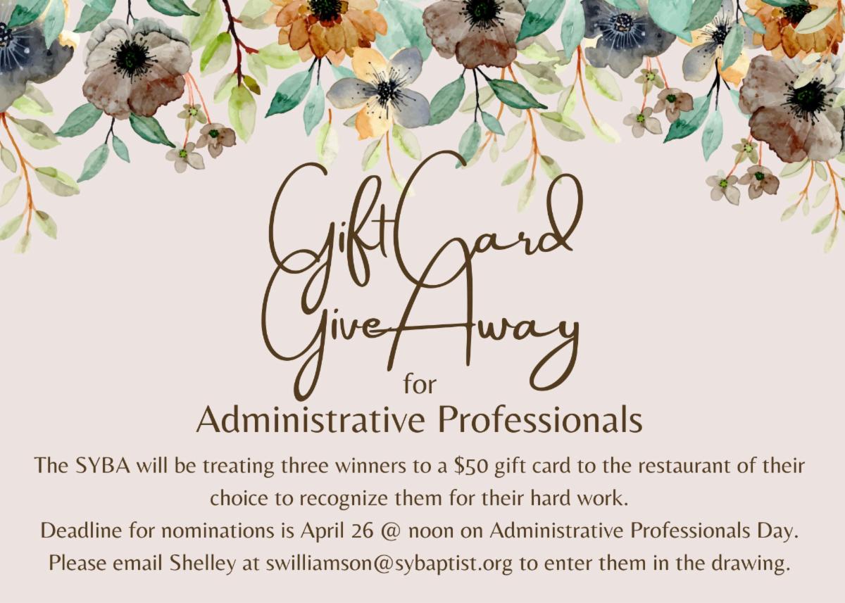 There's still time to nominate your favorite SYBA Administrative Professional to be put into the drawing to win a $50 gift card to their favorite restaurant!