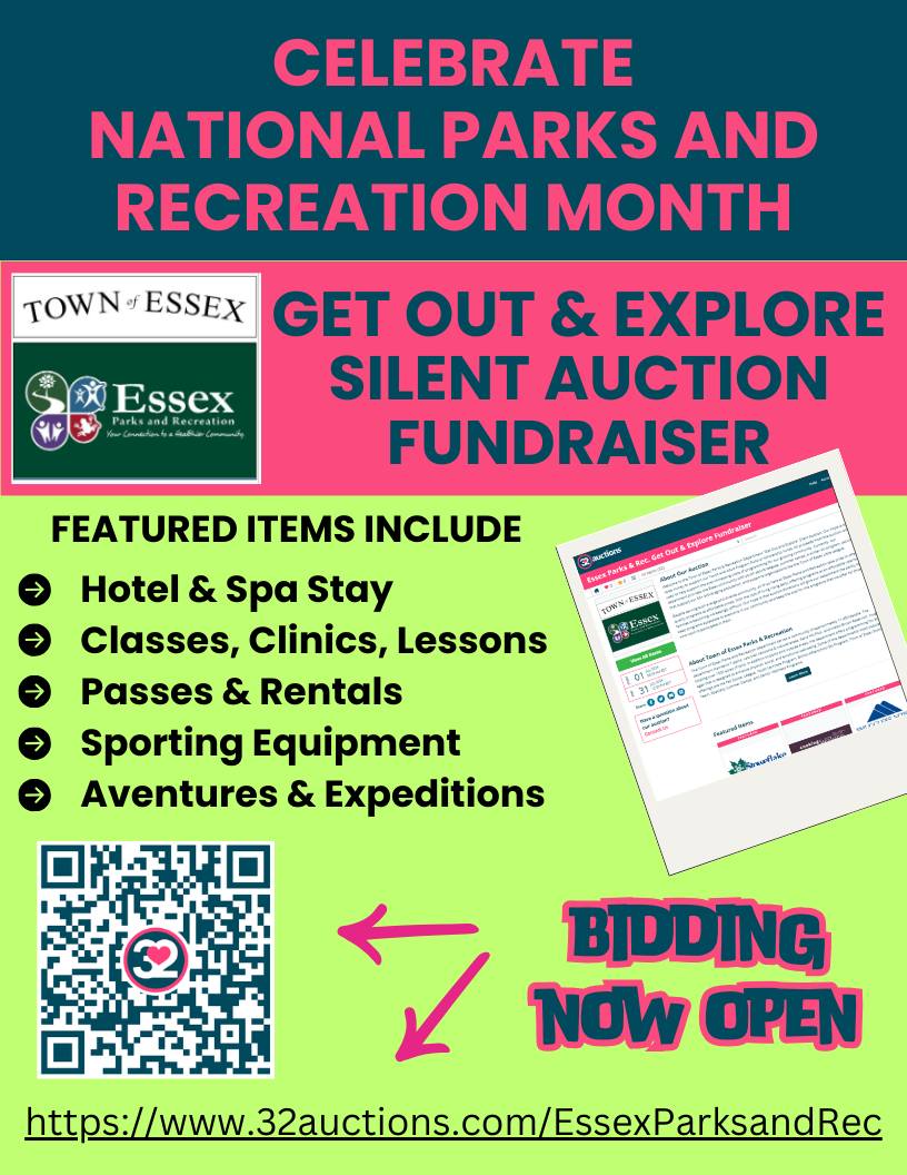 All proceeds from the "Get Out and Explore" Silent Auction will be used to help support the ever-increasing costs of programming for our growing community. Currently, the Essex Parks and Recreation department provides the Essex community with youth sports leagues, summer camps, a winter ski program, activities that support our 55+ active aging population, and supports organizations like the Town of Essex Little League.