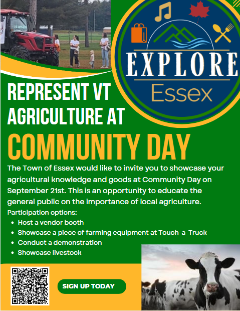 The Town of Essex’s annual Community Day event will take place on September 21st at Foster Road Park in Essex. This event is a celebration connecting our residents, businesses, and organizations that together make up our flourishing community. Currently attending the event are over 40 farmers market/crafts vendors, including 5 food trucks/food vendors. There will also be a Touch a Truck event, hayrides, Alyx the Magician, and musical entertainment.