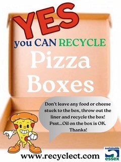 Recycling Reminder: Pizza boxes should be recycled even if they’re stained with grease. Make sure to remove any food scraps and paper liners and flatten the box.