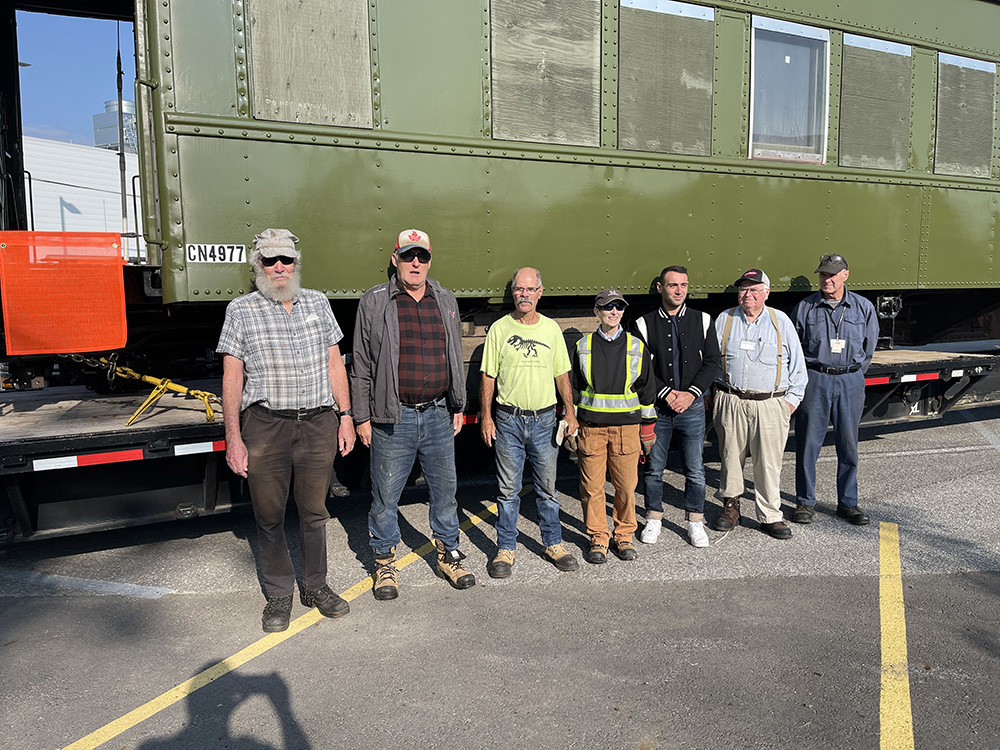Some of the Bytown Railway Society volunteers who helped restore CNR 4977 pose with the coach before its departure from the Canada Science and Technology Museum.