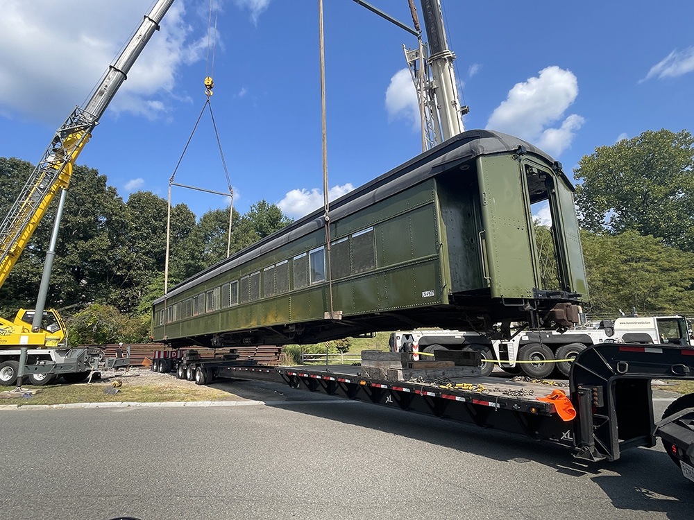 RMNE volunteer Matt Shaw was on hand to assist with the careful project of removing the coach’s two wheel assemblies to allow sufficient clearance to load the 100,000-pound car body. Heavy hauling specialist Equipment Express and crane provider Richards Steel lifted the coach onto an extendable deck trailer, while the two wheel assemblies were placed on two regular trailers. |